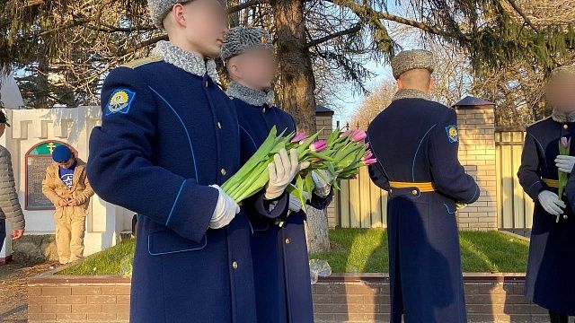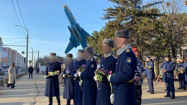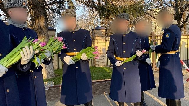 Курсанты Краснодарского высшего военного авиационного училища имени Штеменко и юнармейцы вручили женщинам цветы. На месте работал корреспондент телеканала «Краснодар».