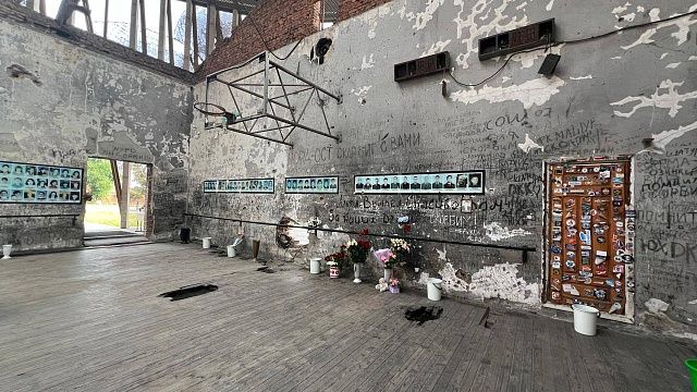 В актовом зале размещены фотографии погибших бойцов спецподразделений «Альфа» и «Вымпел», которые защищали детей. Стены спортивного зала исписаны сотнями надписей со всей России, оставленных людьми в память о жертвах трагедии.