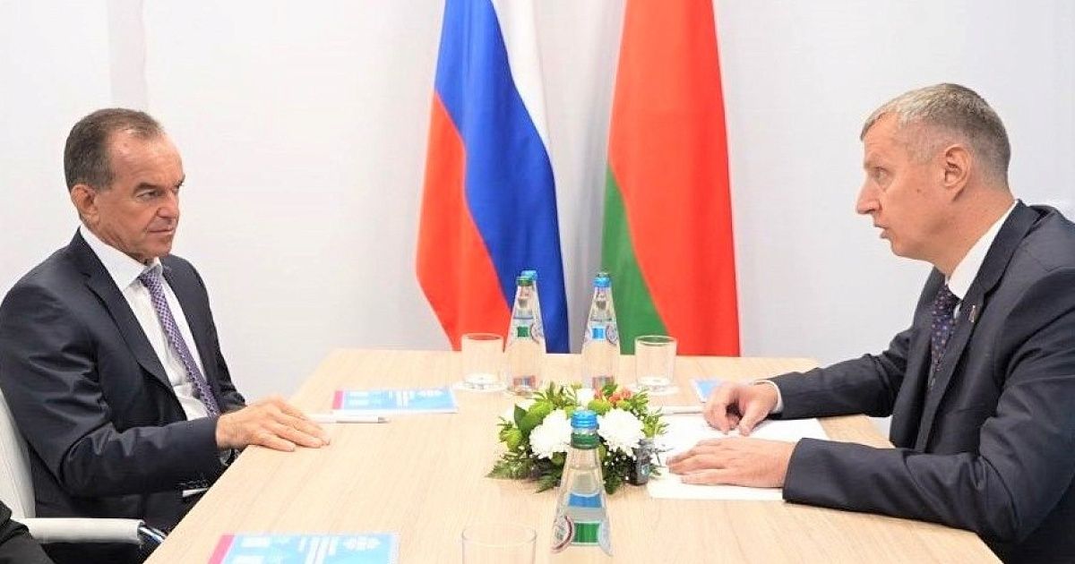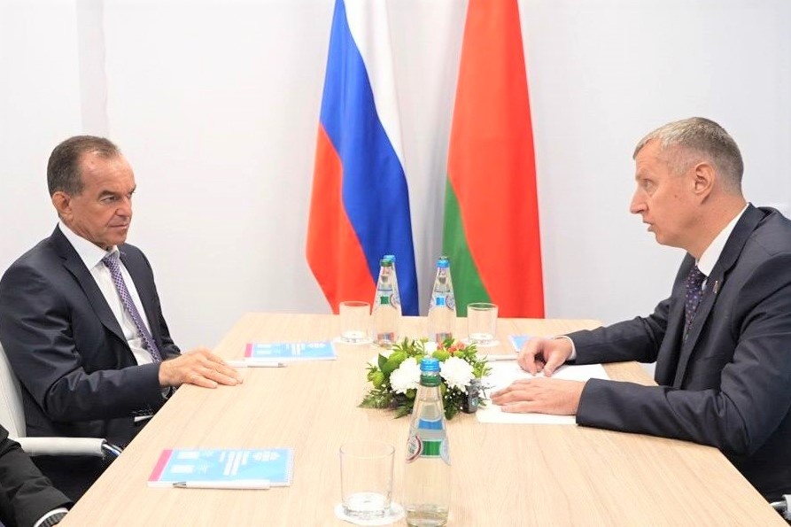 Губернатор Краснодарского края Вениамин Кондратьев встретился в Минске с главой администрации президента Республики Беларусь Дмитрием Крутым. На переговорах обсуждались вопросы кооперации в промышленности, сельском хозяйстве и других сферах экономики.