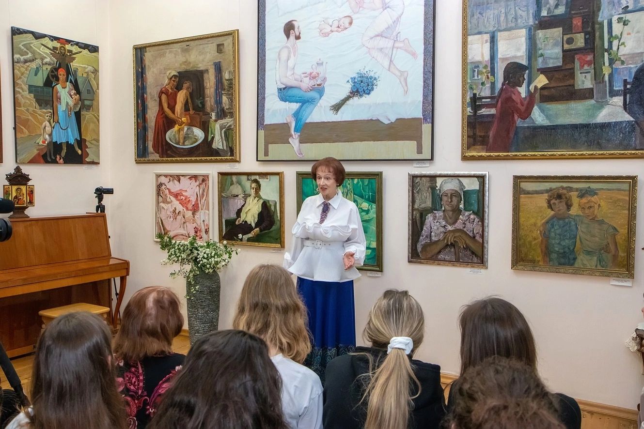 Юных посетителей с наступающим 80-летием Победы поздравили директор галереи Нина Стрижова, завкафедры, художник Елена Саяпина.