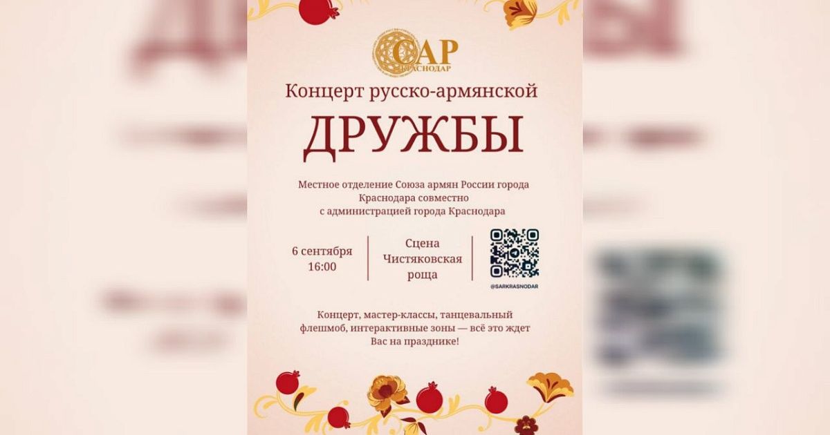 В Краснодаре, 6 сентября, пройдет концерт, посвященный русско-армянской дружбе, сообщает местное отделение Союза армян России.