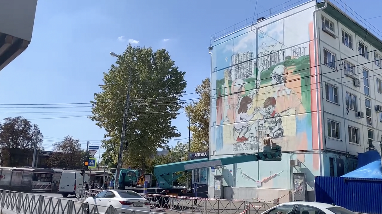 Созданием мурала занимается краснодарский граффити-художник Роман Филиппов. На изображении можно разглядеть играющих детей и стоящих за ними строителей и многоэтажки, окруженные зелеными деревьями.
