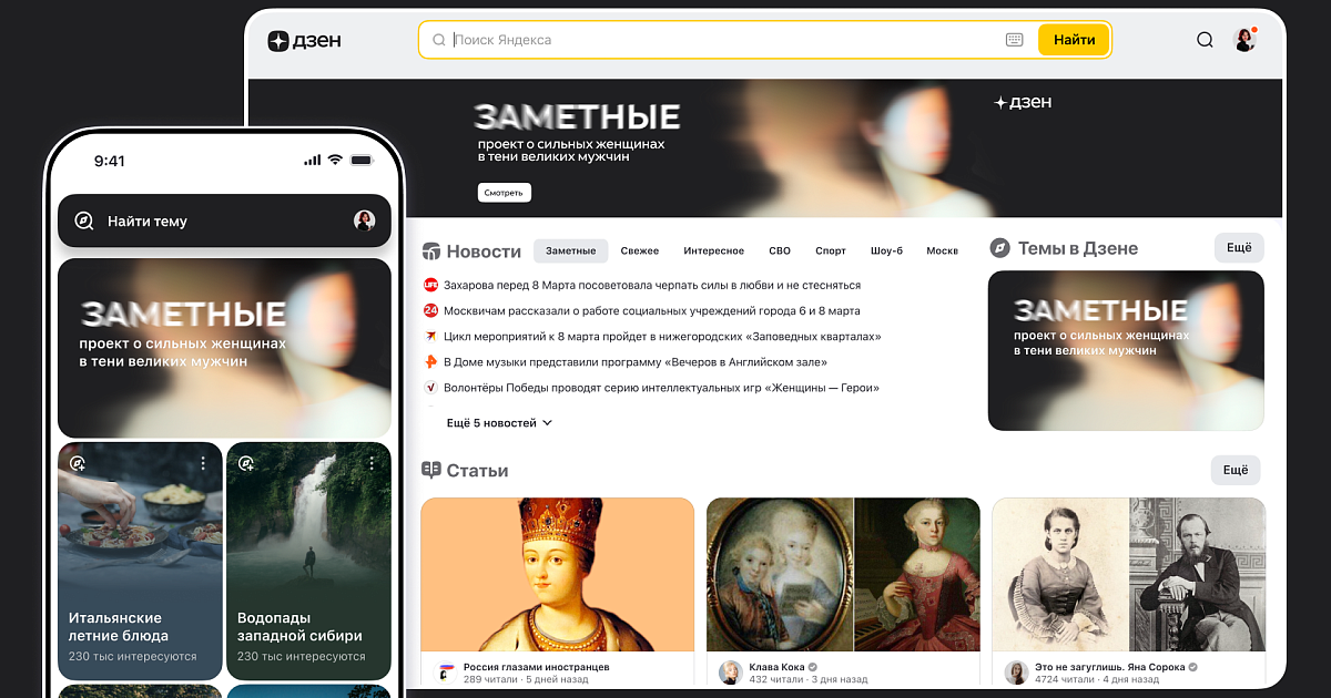 В преддверии 8 Марта платформа Дзен запустила инициативу «Заметные», посвященную женщинам, чьи достижения оставались в тени знаменитых мужчин. В рамках проекта были временно изменены алгоритмы: контент, созданный женщинами и о женщинах, получил дополнительное внимание.