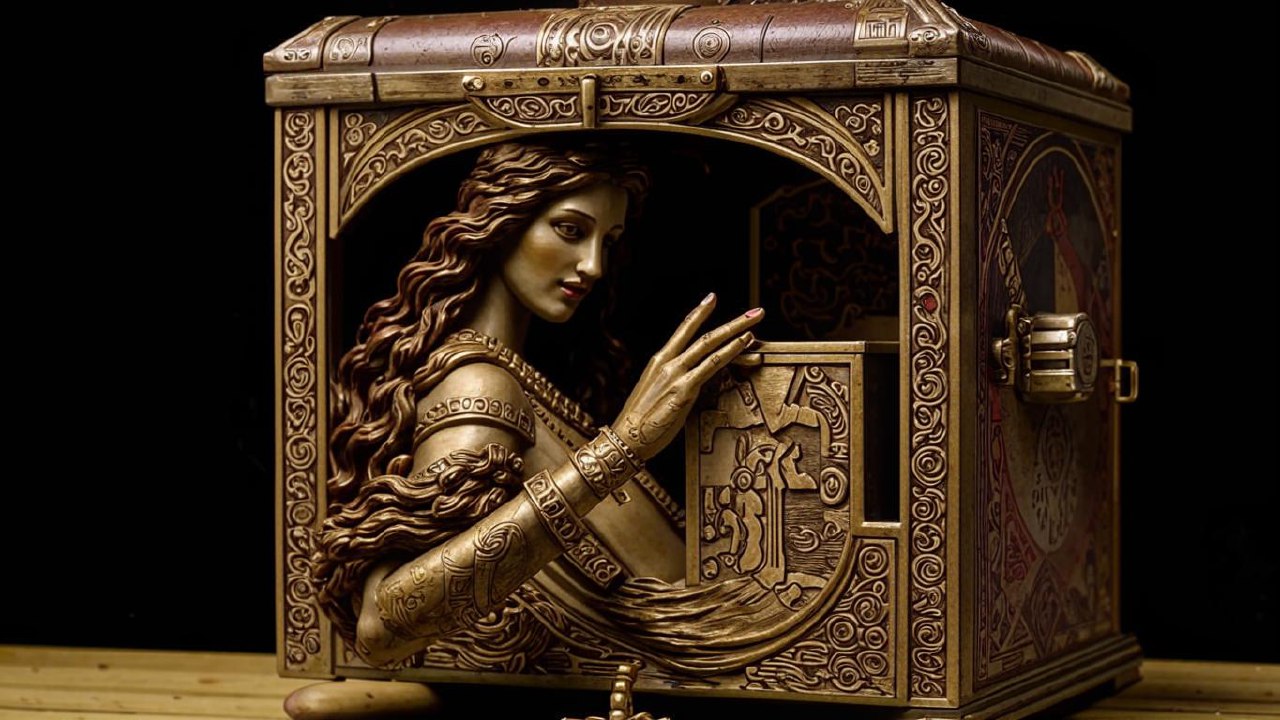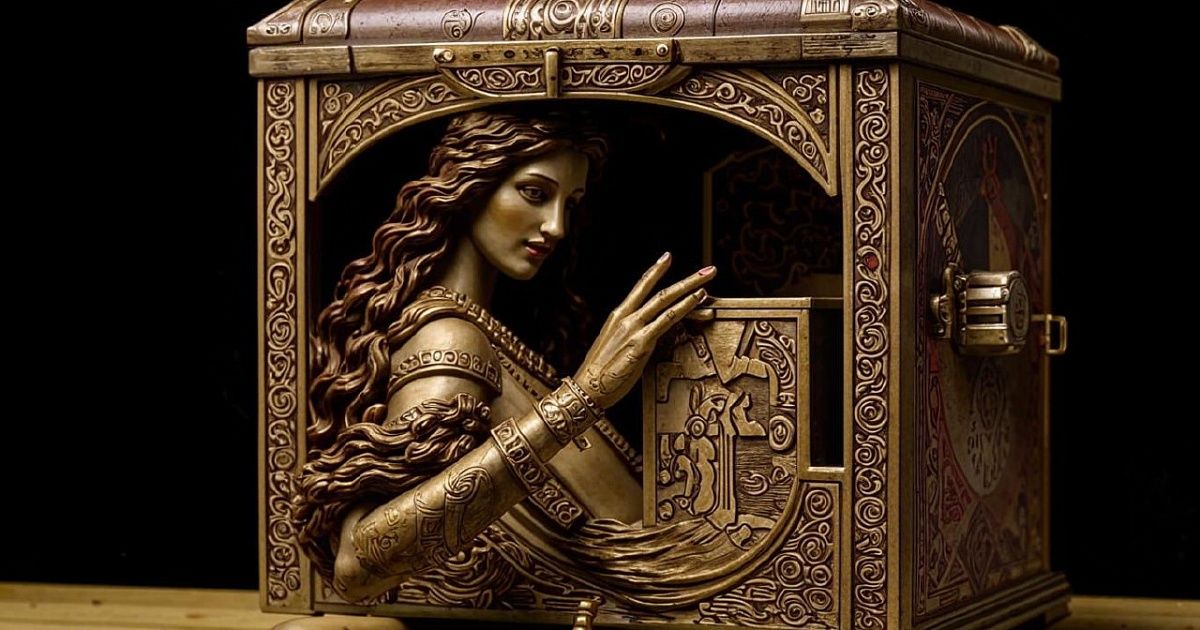 Олимпийские боги собрали дары для влюблённых, которые состояли из радостей и печалей, и закрыли их в чудотворном ларце. На свадьбе ящик преподнесли Пандоре и строго наказали, что открывать его можно только не ранее положенного срока. Невеста не удержалась и захотела проверить, какой сюрприз преподнесли ей уважаемые гости.