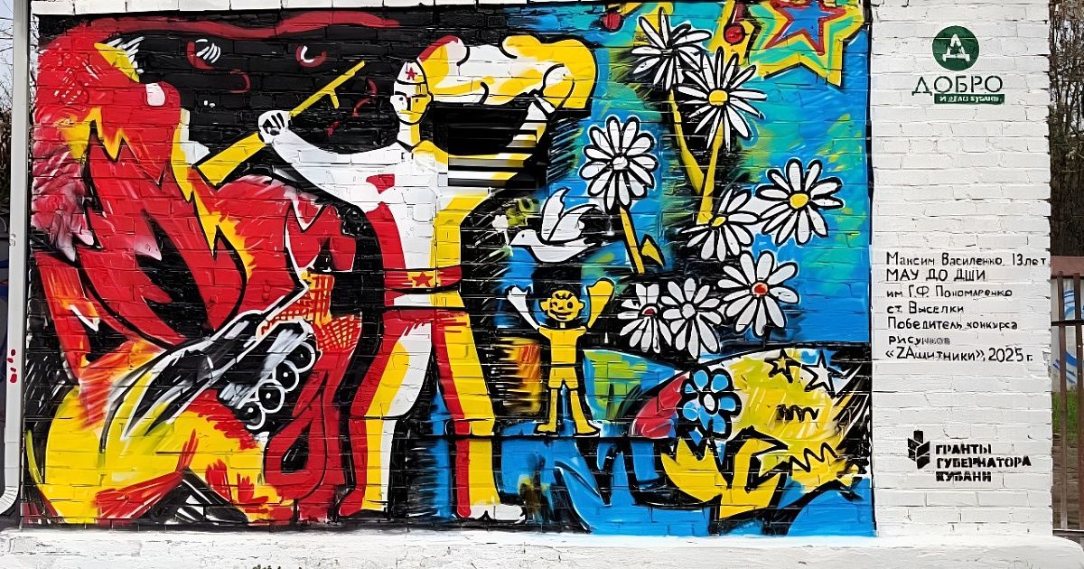 В Центральном округе Краснодара появился новый мурал, созданный по эскизу юного художника — ученика Детской школы искусств имени Пономаренко Максима Василенко. Его работа стала победителем конкурса «Zащитники: сила, честь и отвага России», организованного фондом «Добро и дело» при поддержке губернаторского гранта.