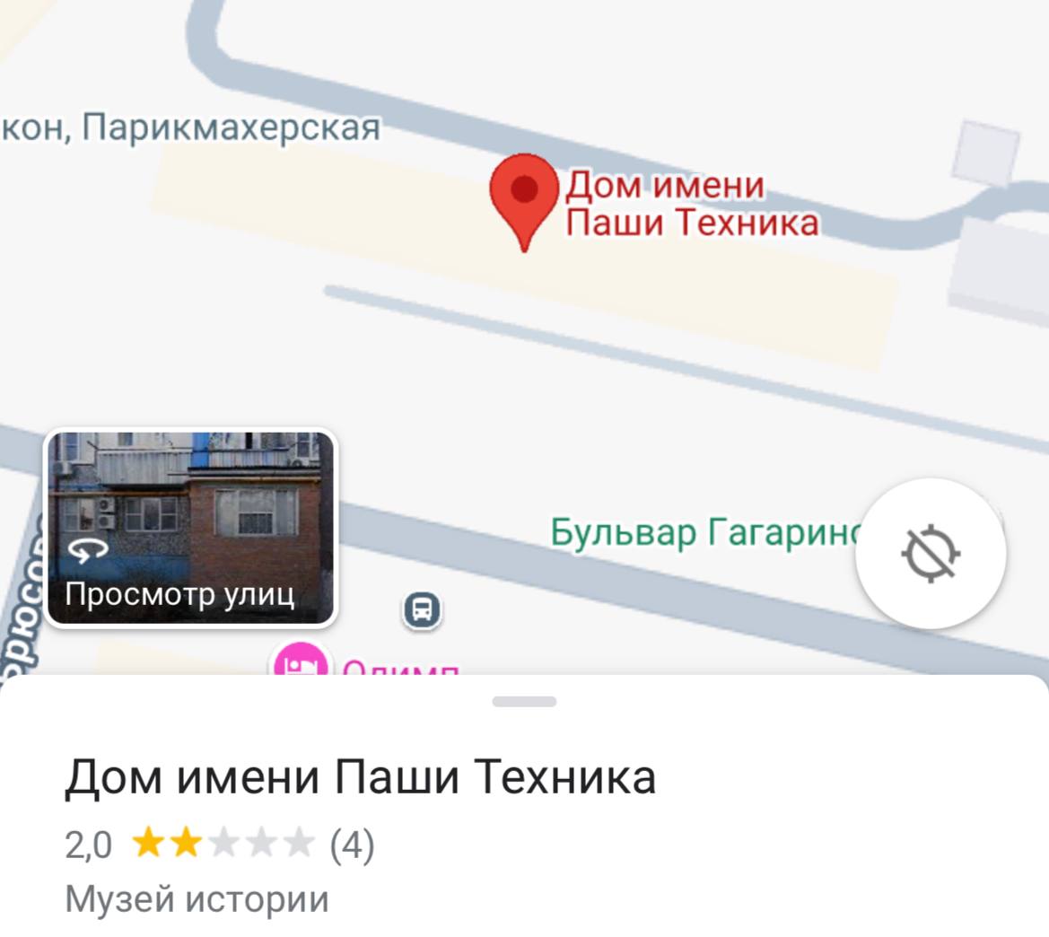 Краснодарцы заметили, что на Google-картах появился дом имени Паши Техника. Здание находится на улице Гагарина в Фестивальном микрорайоне. В сервисе указано, что на этом месте организован «музей истории».