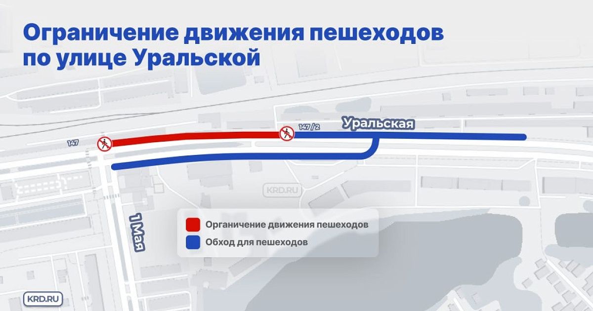 Для строительства надземного пешеходного перехода 9 мая перекроют движение на улице Уральской в районе дома № 147/1. Об этом сообщили на сайте администрации Краснодара.