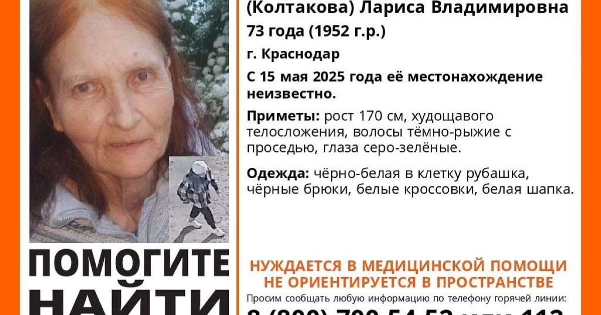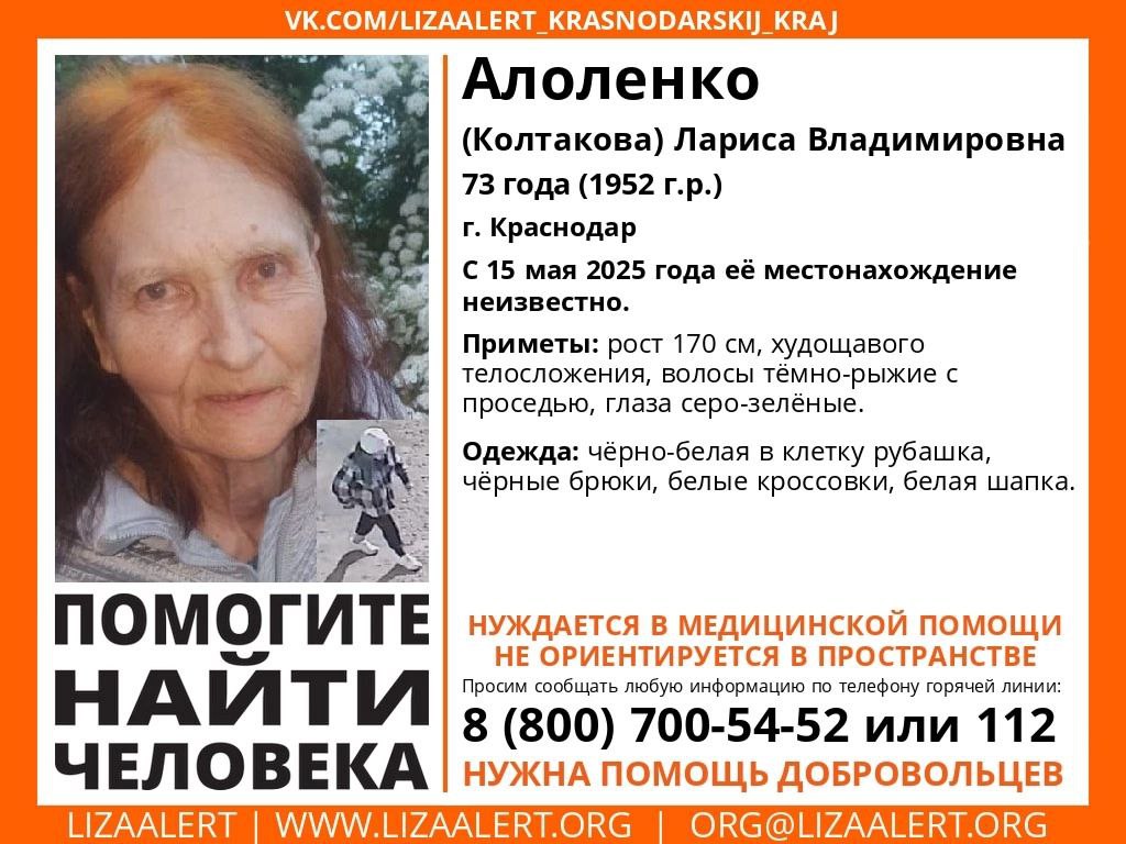 В Краснодаре 15 мая объявили в розыск 73-летнюю Ларису Алоленко (Колтакову), местонахождение которой родственникам неизвестно.