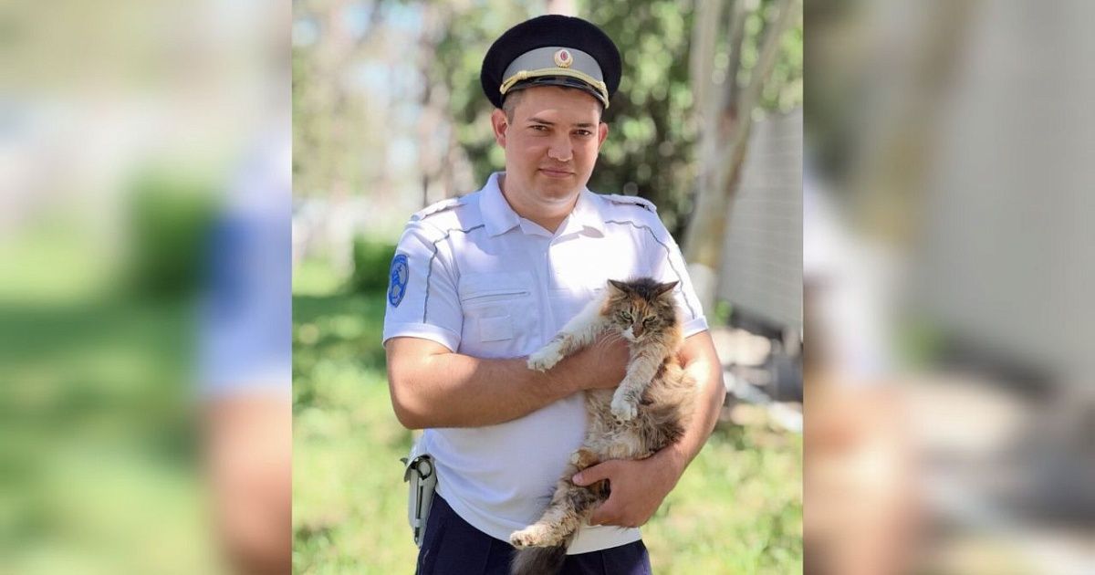Младший лейтенант полиции Никита Пономарев направлялся на службу и по дороге увидел стаю агрессивных псов, которые лаяли на пушистую. Сотрудник правопорядка отогнал дворняг и помог испуганному животному выбраться из-под машины.