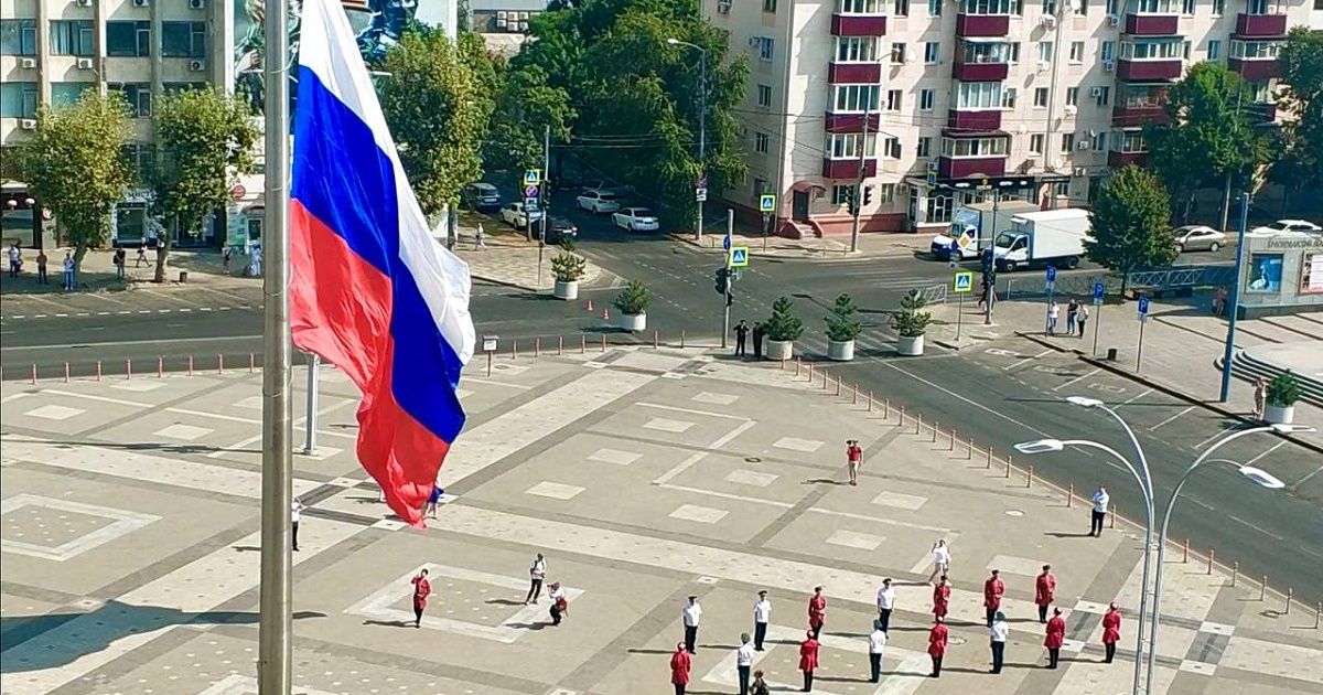 На Главной городской площади Краснодара торжественно подняли триколор в честь Дня России. Флаг размером 10 на 15 метров вынесли участники специальной военной операции и юнармейцы движения «Пост №1».