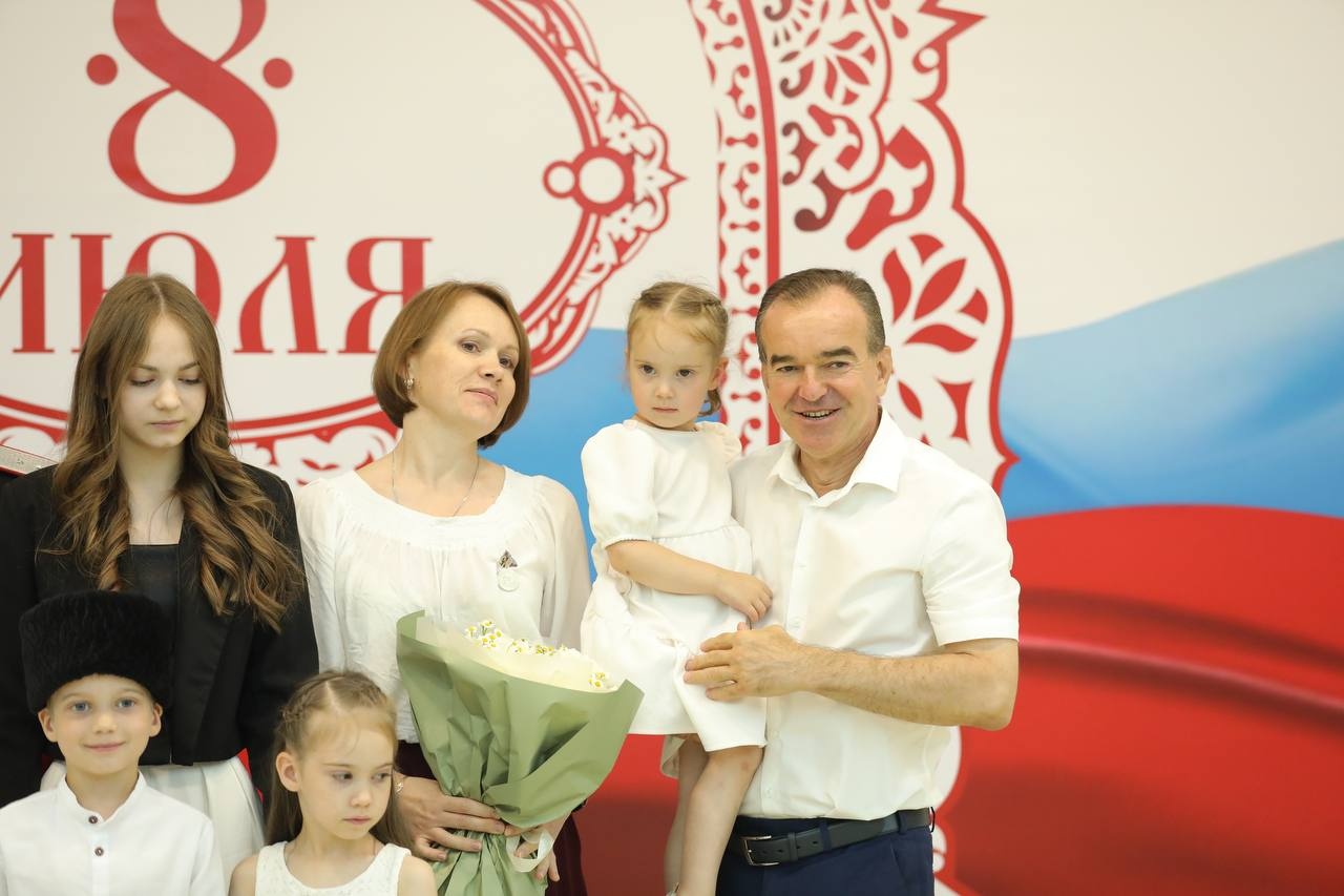 В Краснодаре состоялся торжественный приём, посвящённый Дню семьи, любви и верности. В рамках мероприятия губернатор Краснодарского края Вениамин Кондратьев вручил медали «Родительская доблесть» 15 многодетным семьям региона.