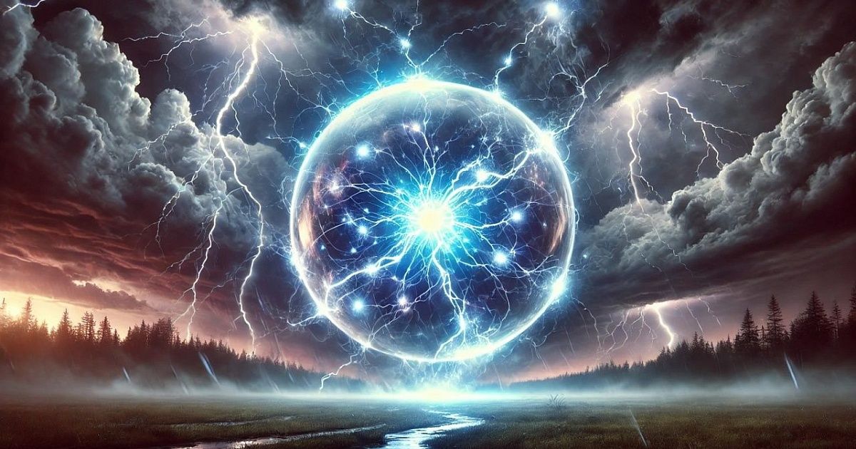 Светящийся огненный шар появился в небе во время сильной грозы.