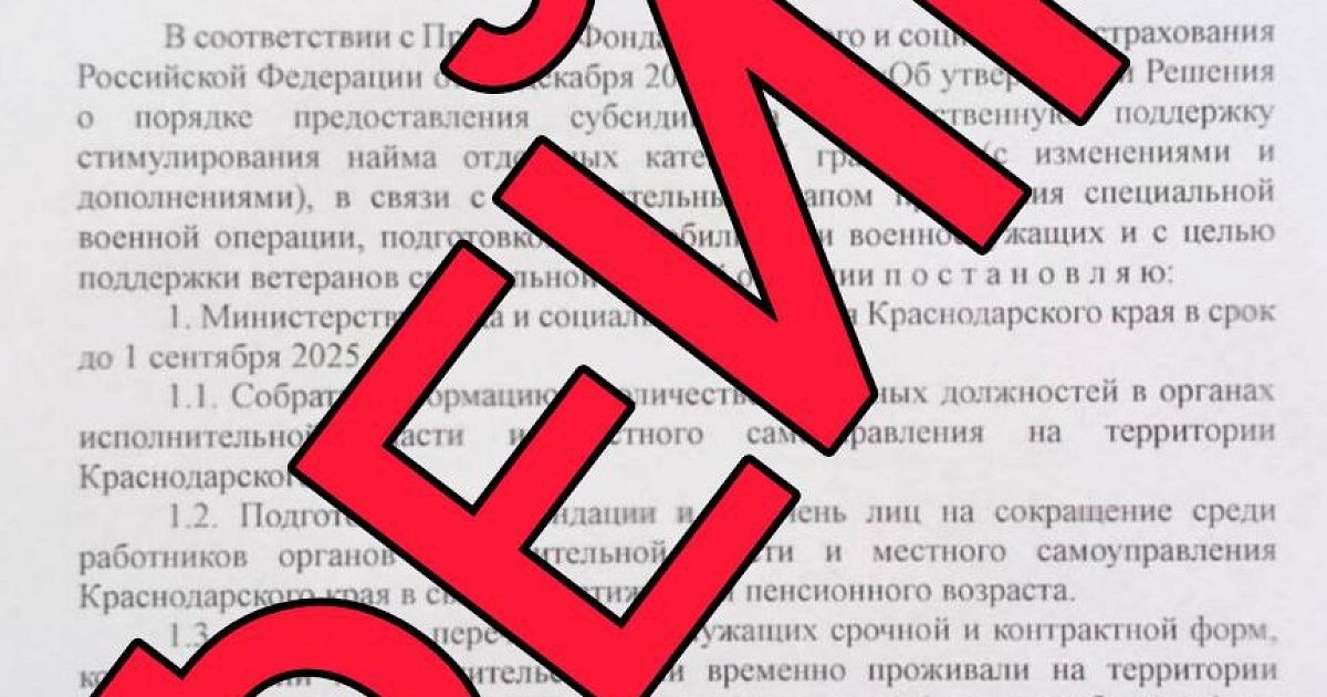 Оперативный штаб Кубани опроверг информацию о постановлении губернатора Вениамина Кондратьева об увольнении госслужащих пенсионного возраста для трудоустройства ветеранов СВО.