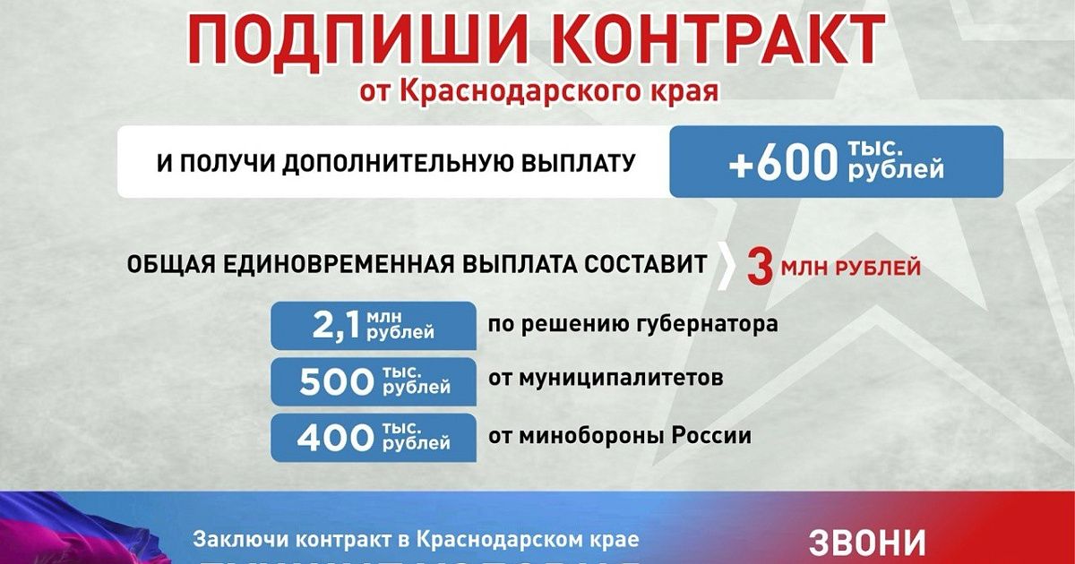 Структура выплаты состоит из: 2,1 миллиона рублей – согласно решению губернатора Вениамина Кондратьева; 500 тысяч рублей – единовременная выплата от муниципальных образований Кубани; 400 тысяч рублей – федеральная выплата для заключивших контракт с Минобороны России.