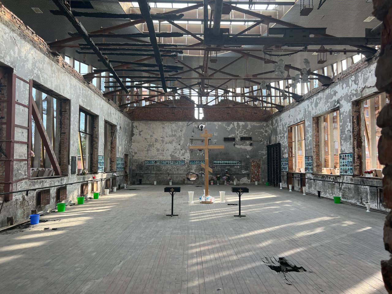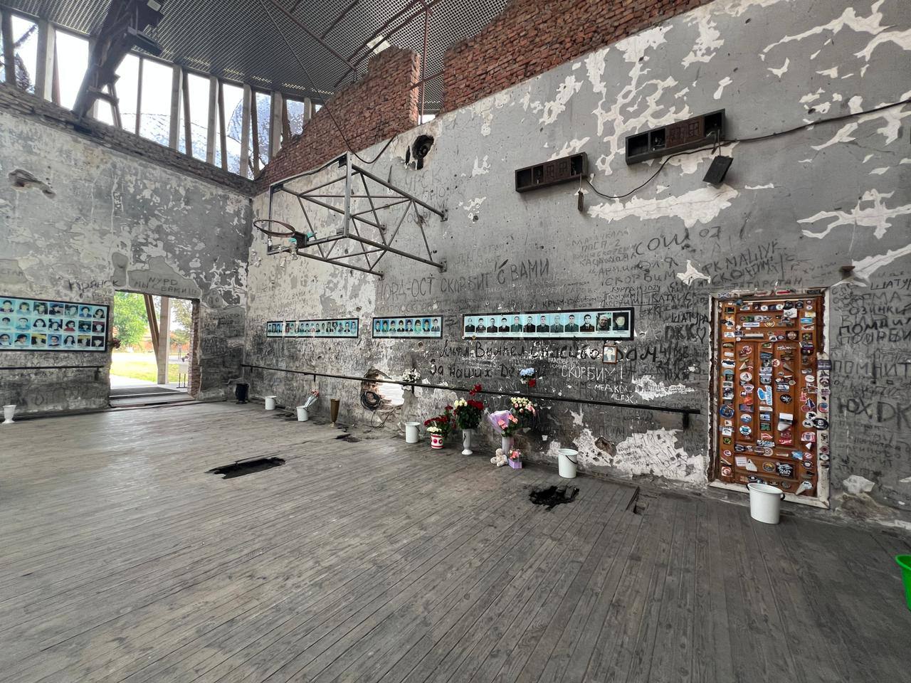 В актовом зале размещены фотографии погибших бойцов спецподразделений «Альфа» и «Вымпел», которые защищали детей. Стены спортивного зала исписаны сотнями надписей со всей России, оставленных людьми в память о жертвах трагедии.