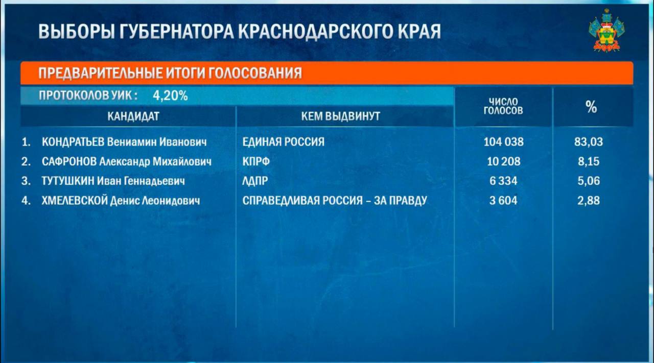 Он набрал 83,03% по итогам обработки первых 4,20% протоколов.