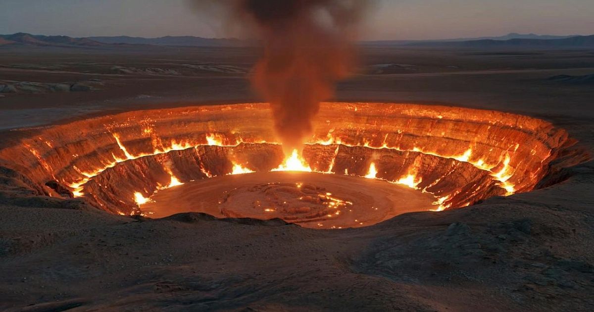 В знаменитой пустыне Каракум в Туркменистане находится уникальный природный объект, который прозвали «Вратами в ад». Главная особенность кратера Дарваза состоит в том, что в нём газ выходит из-под земли, после чего распадается на сотни горящих факелов. Образовалась воронка случайно в результате геологических работ, а пожар на месте их проведения продолжается до сих пор. На протяжении нескольких десятков лет учёные продолжают спорить: можно ли потушить «вечное возгорание» или нужно ли принимать подобные меры?