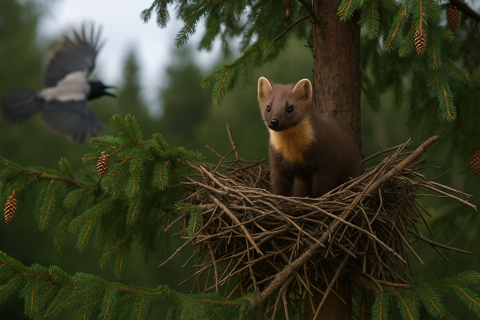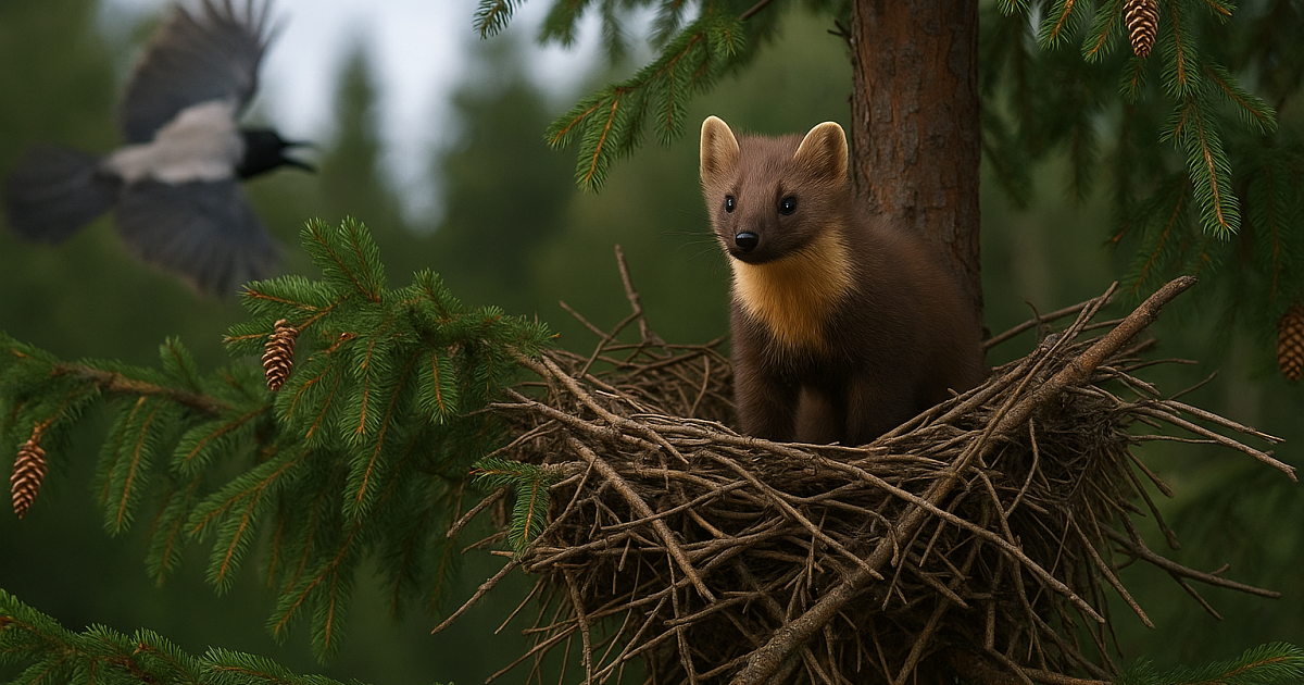 — Я среагировала на крики птиц и увидела куницу, которая в панике спряталась в птичье гнездо на верхушке ели, — рассказала фотограф.