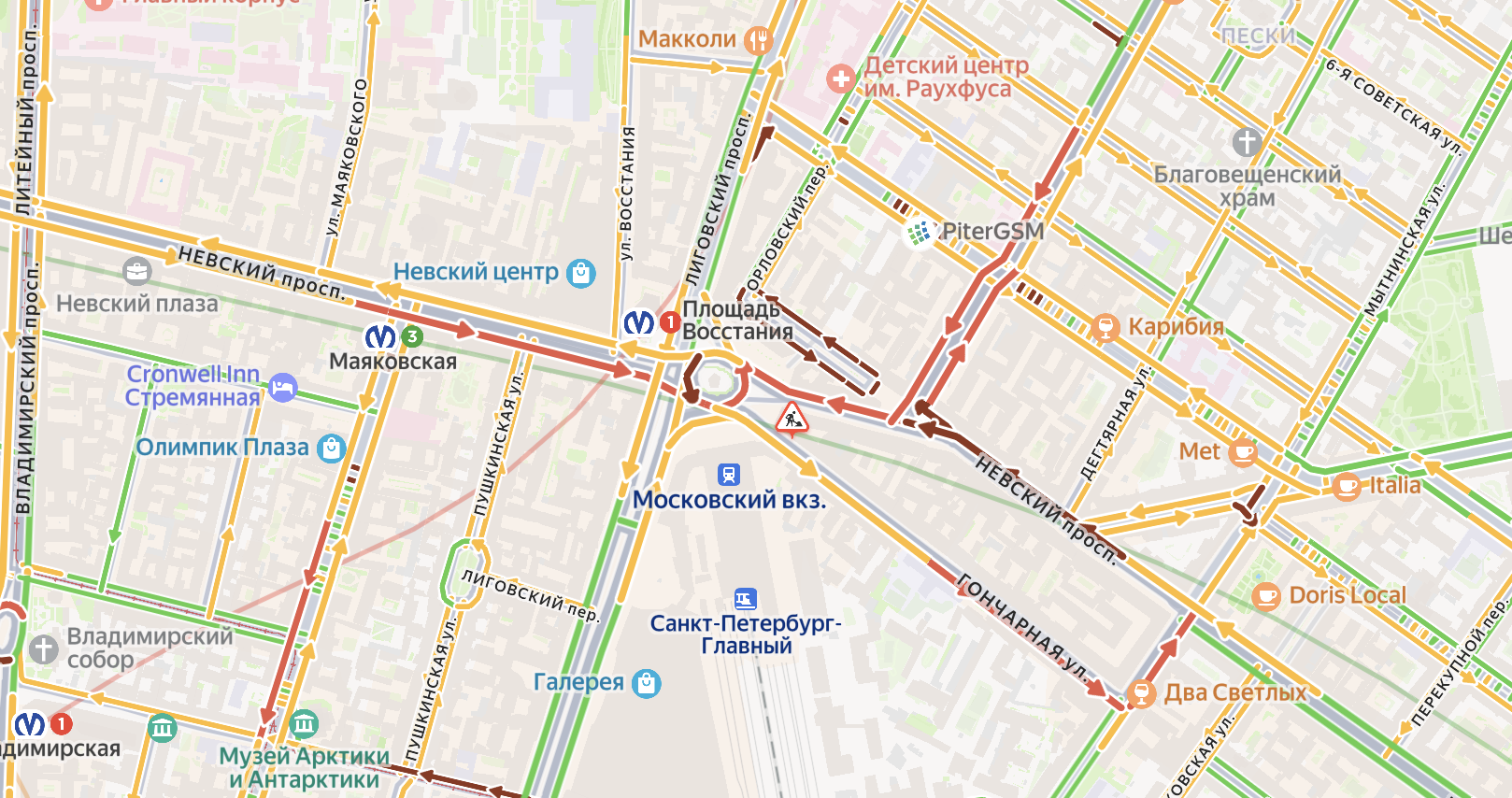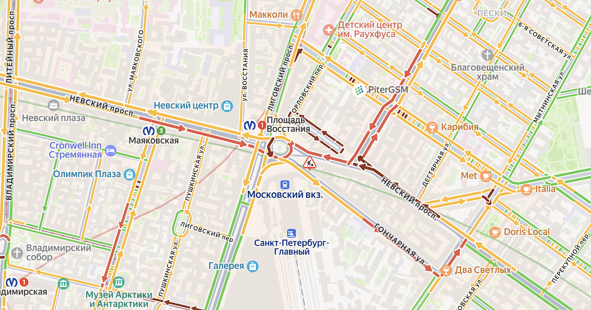 Очевидцы сообщили, что общественный транспорт встал в районе площади Восстания. Несколько трамваев и троллейбусов оказались обесточены и не смогли продолжить движение. Из-за этого на подъездах к площади собрались плотные заторы, движение затруднено как по Невскому, так и по Лиговскому проспекту, Староневскому и улице Восстания.