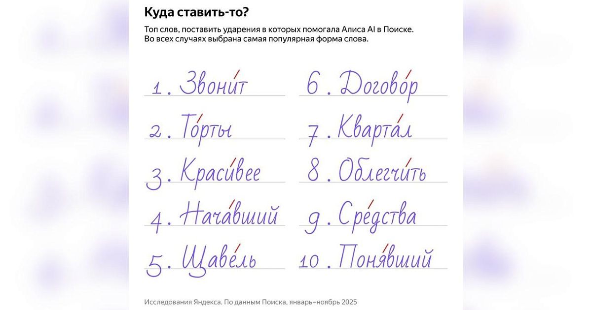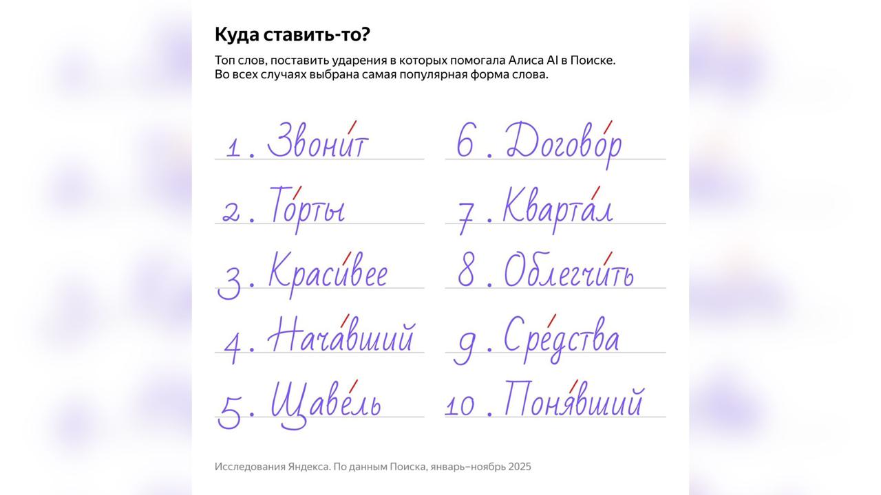 Ко Всероссийскому Дню словаря аналитики изучили поисковые запросы со словом «ударение» и определили, в каких словах пользователи чаще всего просят помощи у Алисы AI. По итогам 2025 года нейросеть чаще всего уточняла ударение в словах «звонить» (включая формы «звонит», «звонят»), «торты», «красивее», «начинать», «щавель», «договор», «квартал», «облегчать», «средства» и «понимать».
