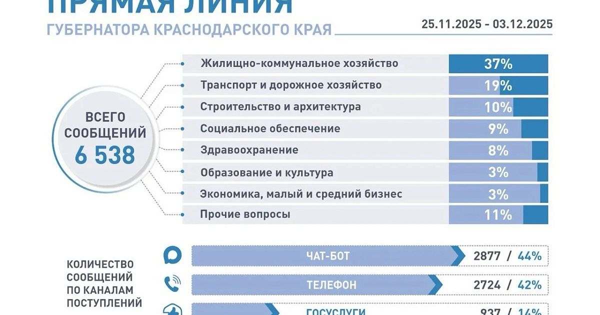 Жители чаще всего отправляют вопросы через чат-бот — 44% обращений. На втором месте — телефон (42%). Еще 14% поступило через «Госуслуги». Самыми активными стали жители Анапы, Туапсинского округа, Краснодара, Щербиновского и Темрюкского районов.
