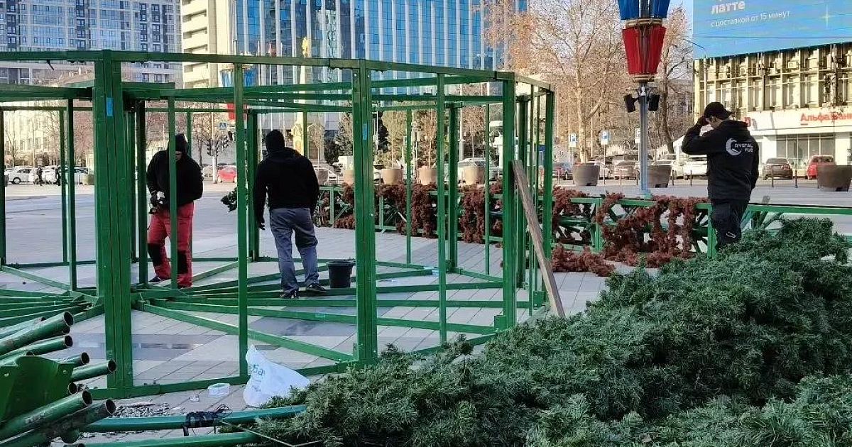 На Главной городской площади Краснодара стартовали работы по установке центральной новогодней ели. Конструкцию высотой 22 метра начали собирать в первые дни декабря, а завершить монтаж и оформление планируют к середине месяца.