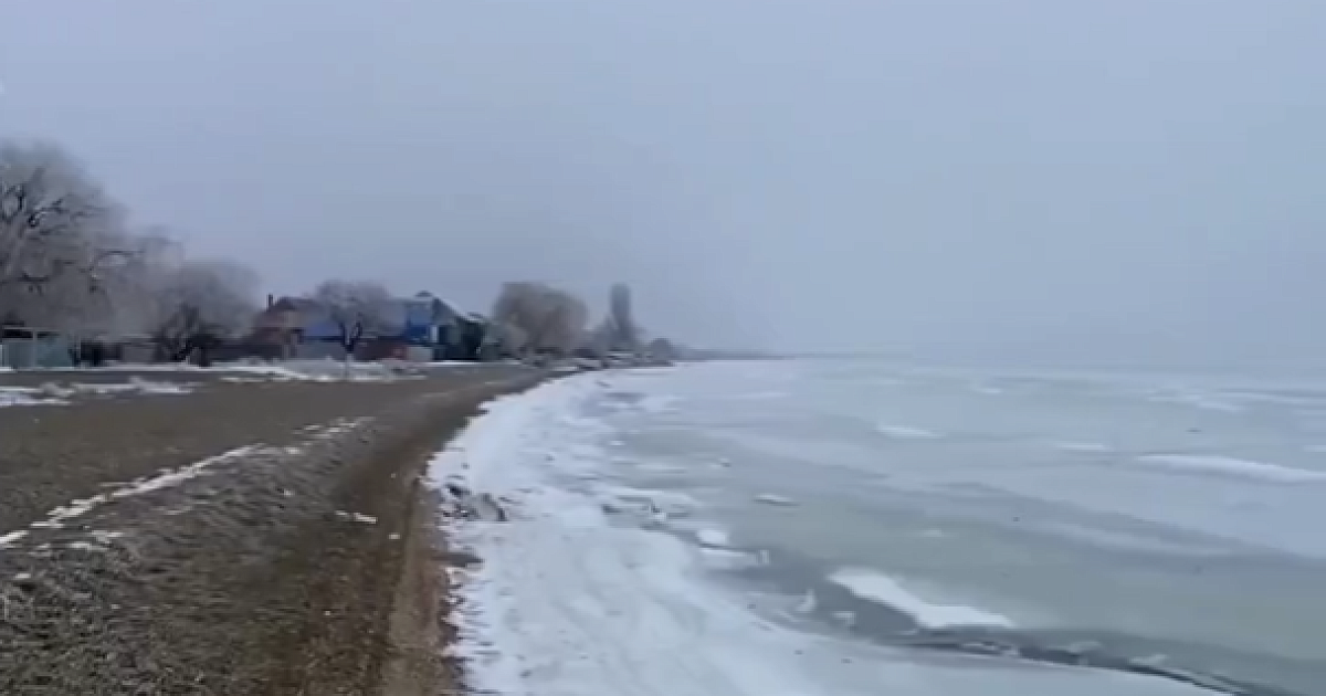 Азовское море покрылось льдом. Видео опубликовал медиахолдинг «Краснодар» в своем канале в МАХ.
