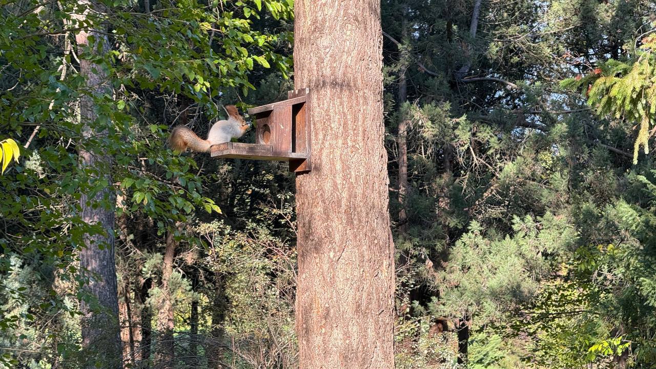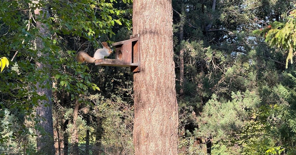 Сначала одна белка сначала робко наблюдала за сотрудниками из-за окон, а позже начала регулярно сидеть на ветках местных сосен. Решив поддержать лесную гостью, сотрудники создали для нее удобную кормушку, которую ежедневно наполняют свежими орехами, сырыми семечками, кусочками яблок и моркови.