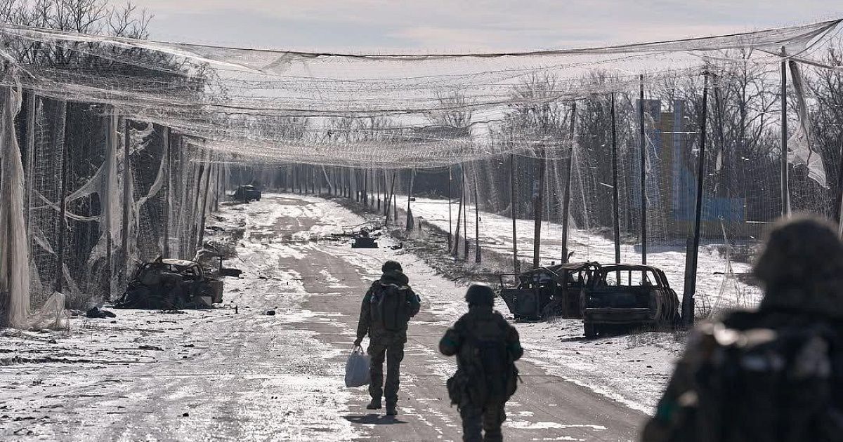 На снимках видно дорожное полотно, над которым натянуты противодронные сети. По обочинам расположены сгоревшие и поврежденные автомобили, перевернутая бронетехника, а также фрагменты беспилотников. На отдельных кадрах зафиксированы наземные дроны и обломки боеприпасов. Местность частично покрыта снегом, заметны следы разрушений и воронки.