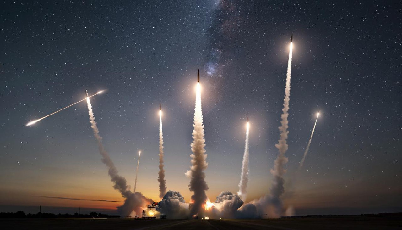 Кадр демонстрирует заключительную фазу полёта сверхтяжёлой ракеты. На фото видно, как от неё отделяется и несется к земле сгусток из нескольких десятков боевых элементов, образующих «огненный дождь». По информации источника, на кадре зафиксирован момент разделения кассетной боевой части, содержащей до восьмидесяти поражающих блоков.