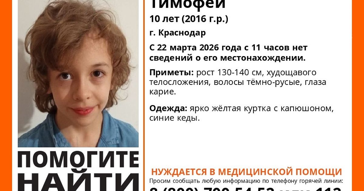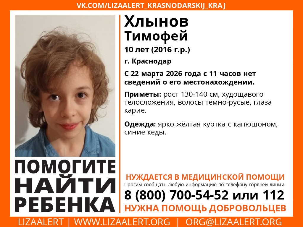 Утром 22 марта 10-летний Тимофей ушел из дома в населенном пункте Краснодарский и так и не вернулся.