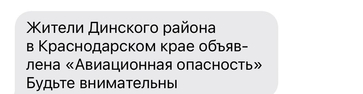 ― Жители Динского района, в Краснодарском крае объявлена «Авиационная опасность». Будьте внимательны, ― говорится в смс-оповещении.
