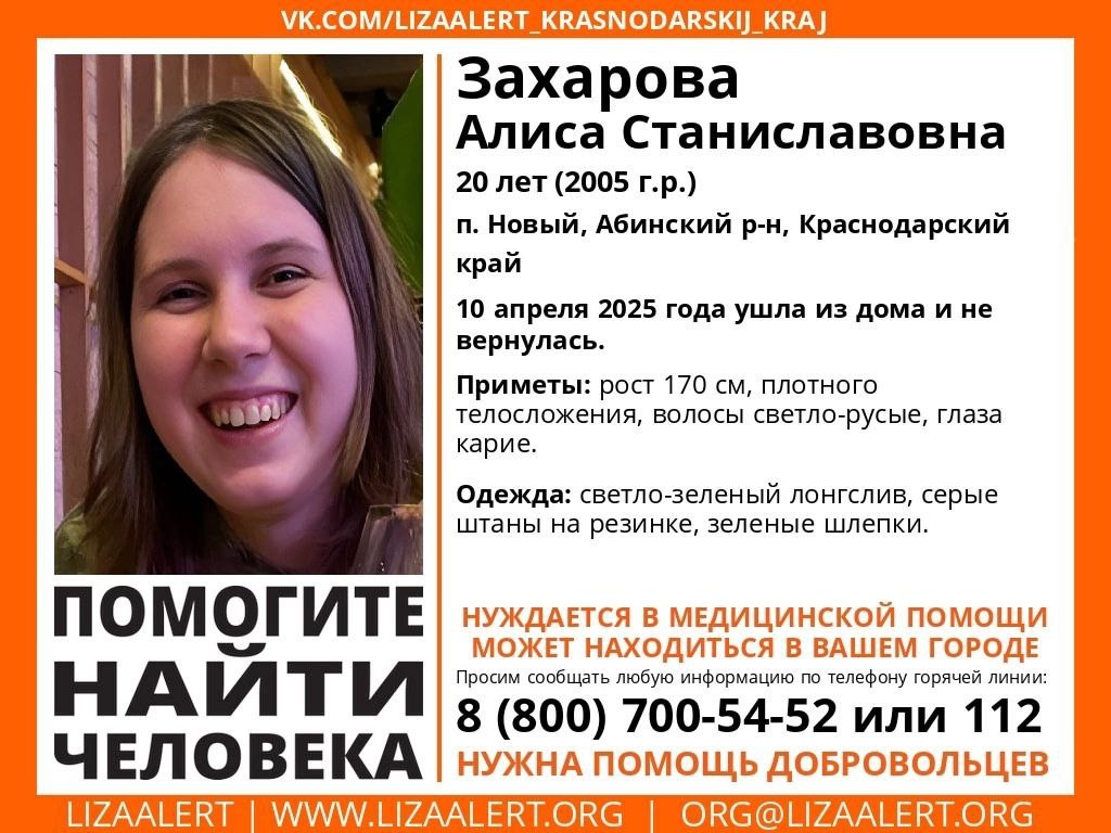 Место нахождение Алисы Захаровой неизвестно с 10 апреля. Она вышла из дома в посёлке Новый Абинского района и не вернулась. На контакт с родными не выходила.