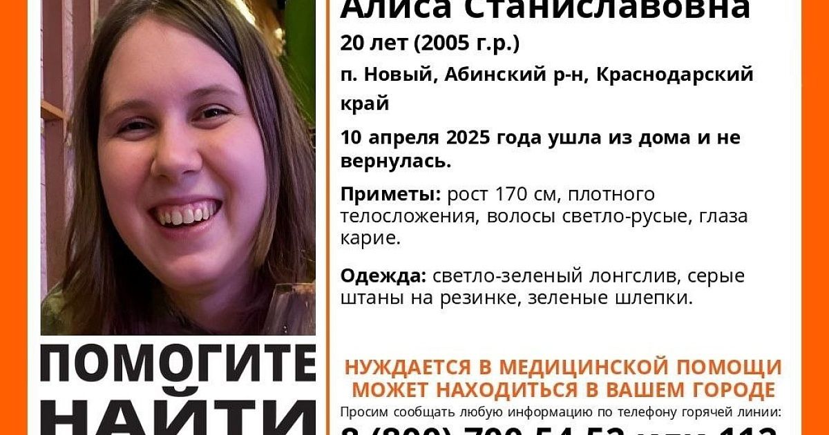 Девушке 20 лет. Она нуждается в медицинской помощи. Рост Алисы – 170 см, телосложение плотное. Волосы – светло-русого цвета, глаза – карие. В последний раз её видели в светло-зелёном лонгсливе, зелёных шлёпанцах, серых штанах на резинке.