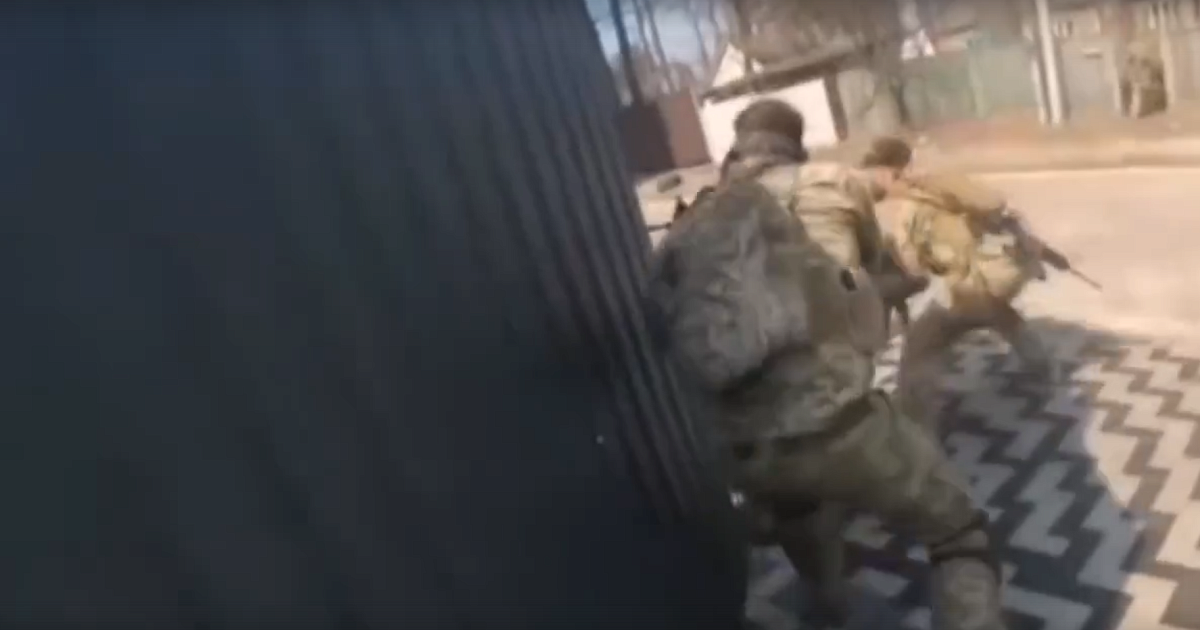 На кадрах видно, что у военных – синие повязки на рукавах. Они отдают приказы и переговариваются на английском языке. На фоне звучит интенсивная стрельба.