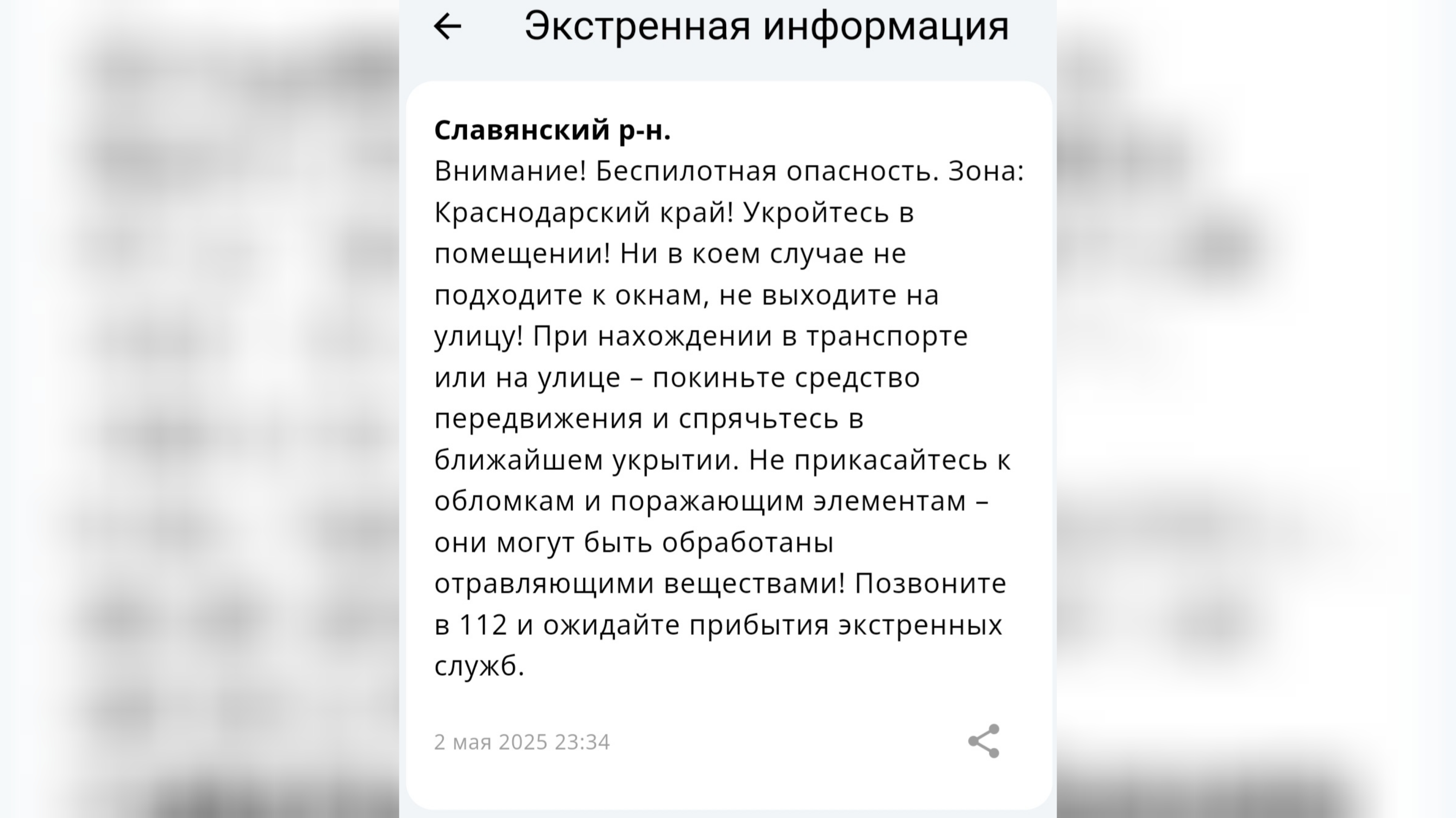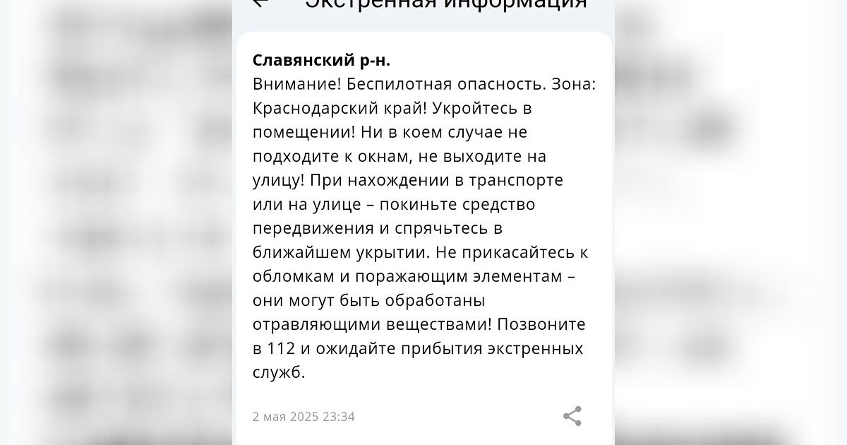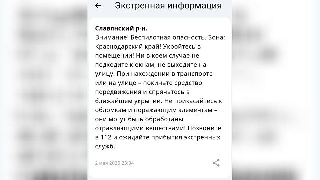 В Краснодарском крае поздно ночью 2 мая была объявлена беспилотная опасность. Жители региона получили информационные сообщения от Единой государственной системы предупреждения и ликвидации чрезвычайных ситуаций.