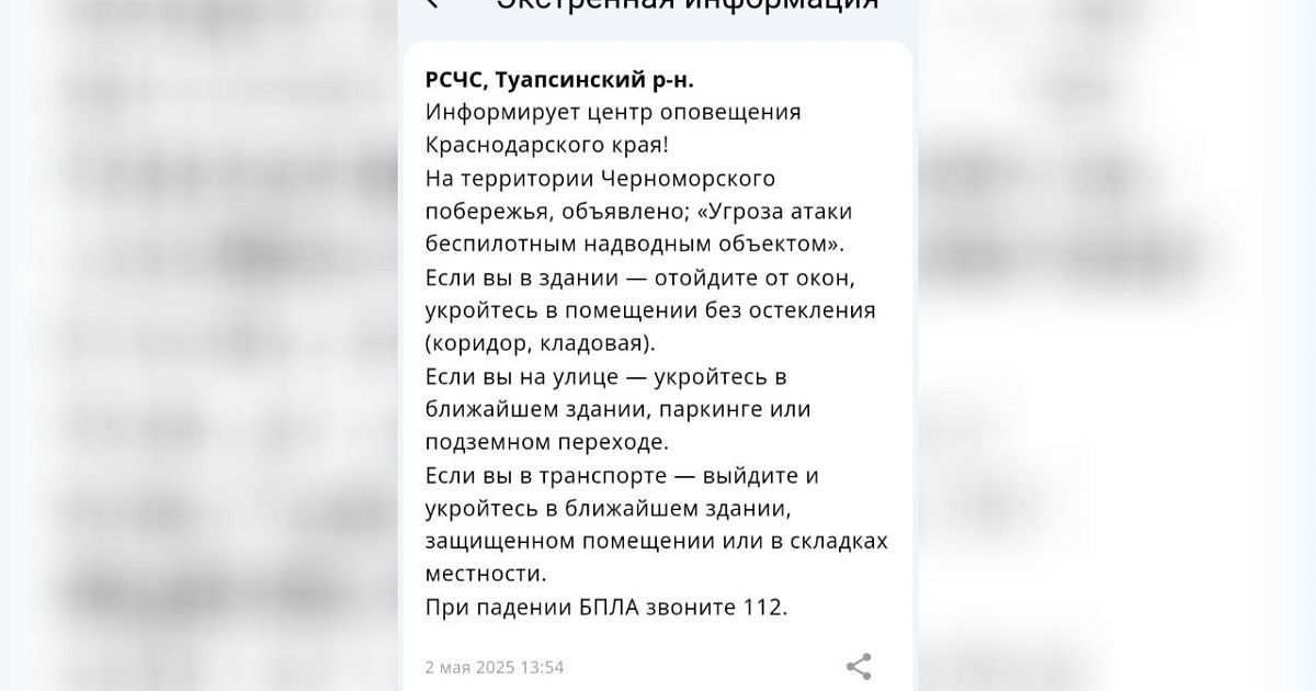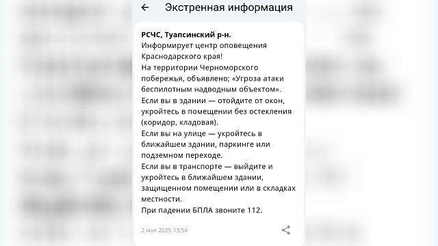Жителей Туапсинского и Темрюкского районов предупредили об угрозе атаки беспилотным надводным объектом. Экстренные сообщения поступили по информационным каналам Единой государственной системы предупреждения и ликвидации чрезвычайных ситуаций центра оповещения Краснодарского края.