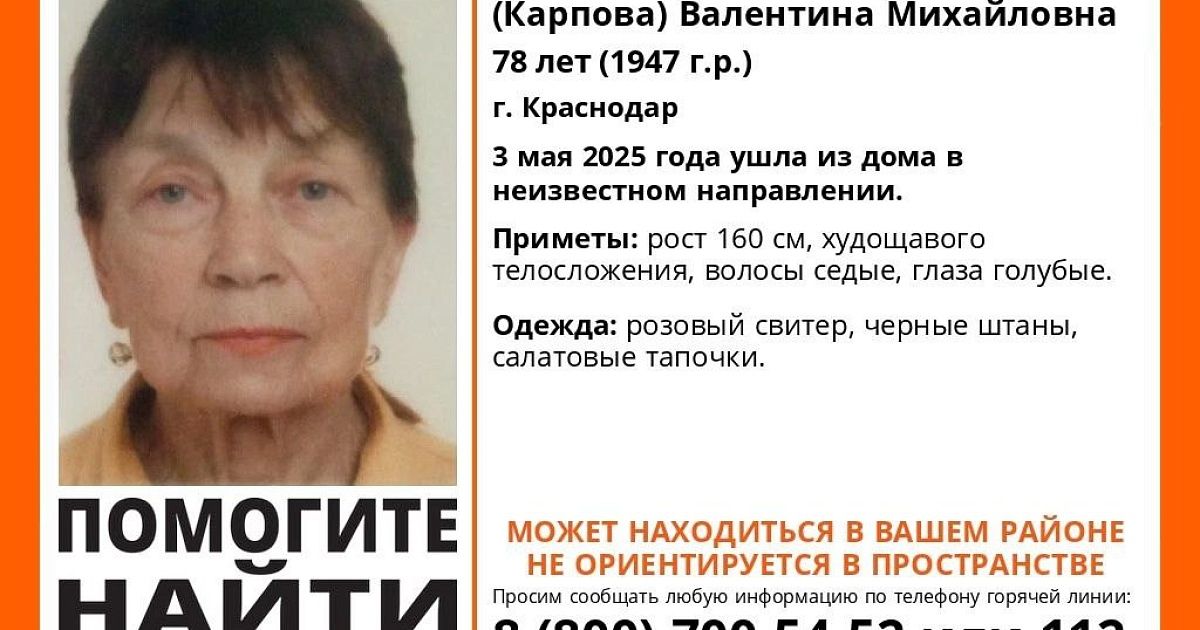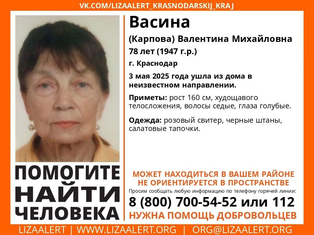 Волонтеры поискового движения «ЛизаАлерт» опубликовали сообщение о пропаже 78-летней жительницы Краснодара. Валентина Васина (Карпова) ушла из дома 3 мая. Больше суток о ее местонахождении ничего не известно.