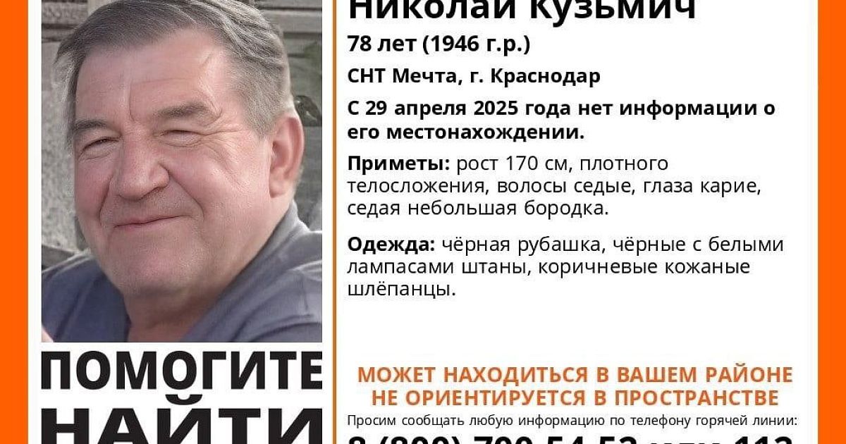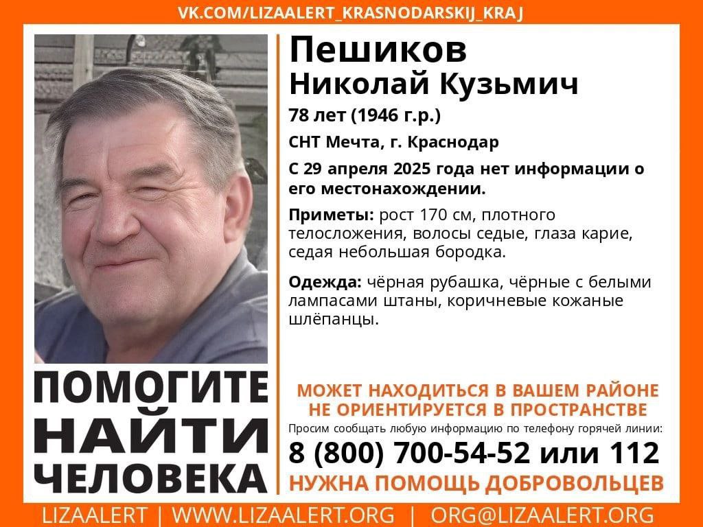 Николаю Кузьмичу Пешикову — 78 лет. Он родился в 1946 году. О нём и его месте нахождения ничего неизвестно с 29 апреля 2025 года.
