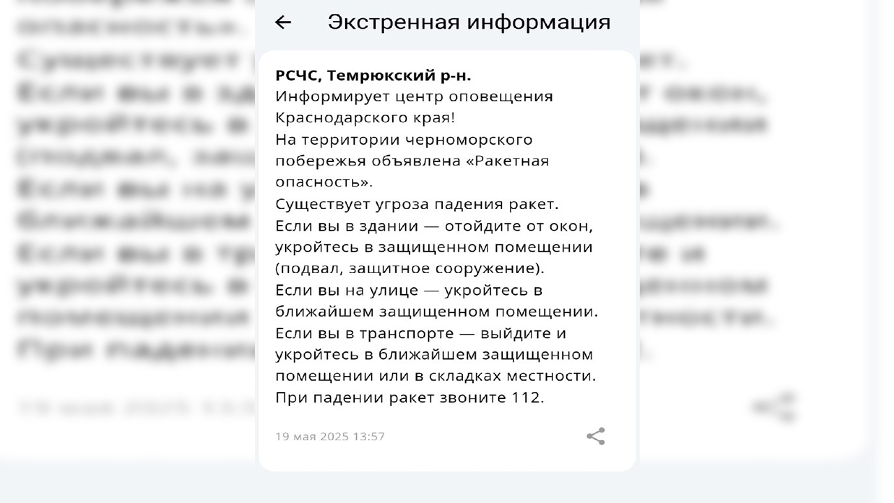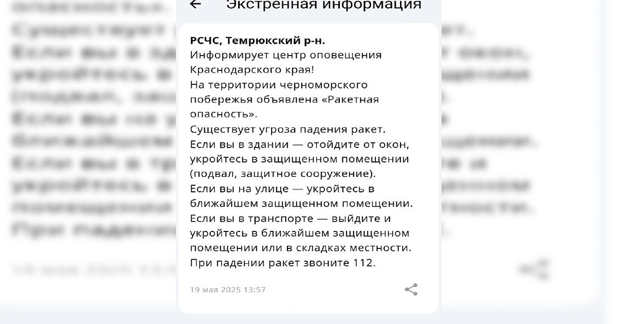 Ракетную опасность объявили в Темрюкском районе. Соответствующие уведомления жителям региона разослала система оповещения РСЧС.