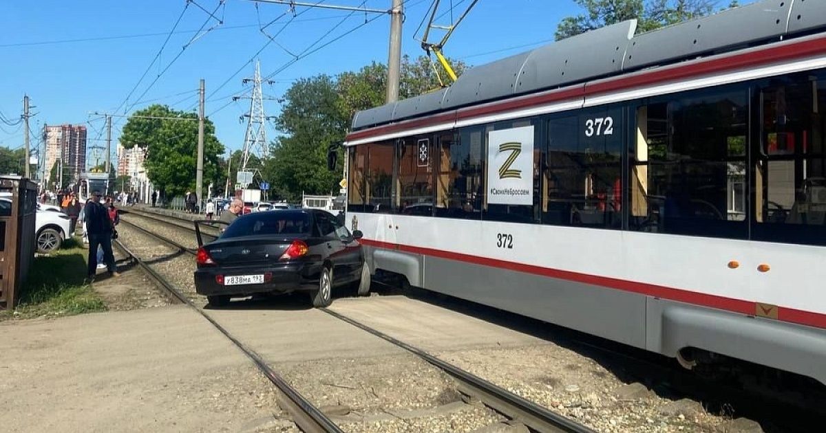 Легковушка влетела в трамвай около остановки «ТЭЦ». Очевидцы прислали видео в Telegram-канал телеканала «Краснодар».