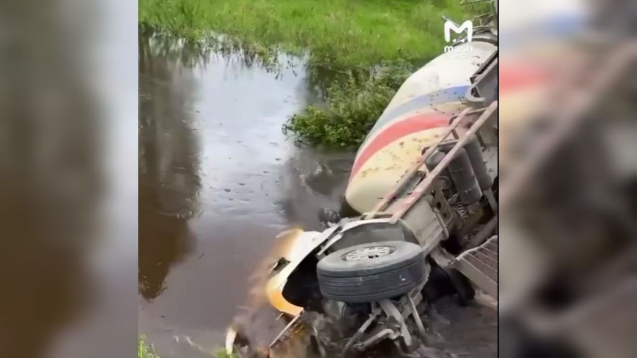 В Ленинградской области бетономешалка упала с моста в реку, видео опубликовал телеграм-канал «Mash на Мойке».
