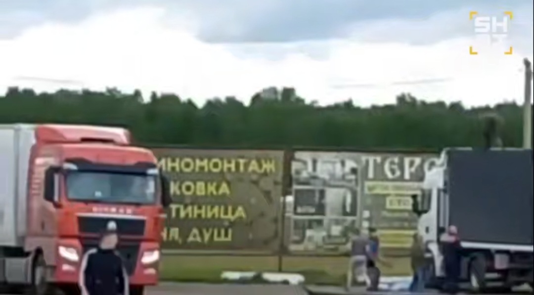 На видео сняли попытки мужчин остановить дроны из грузовика в Иркутсткой области. Кадры прислали в Telegram-канал «SHOT».