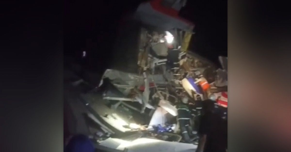 Один из вагонов поезда раздавило путепроводом.