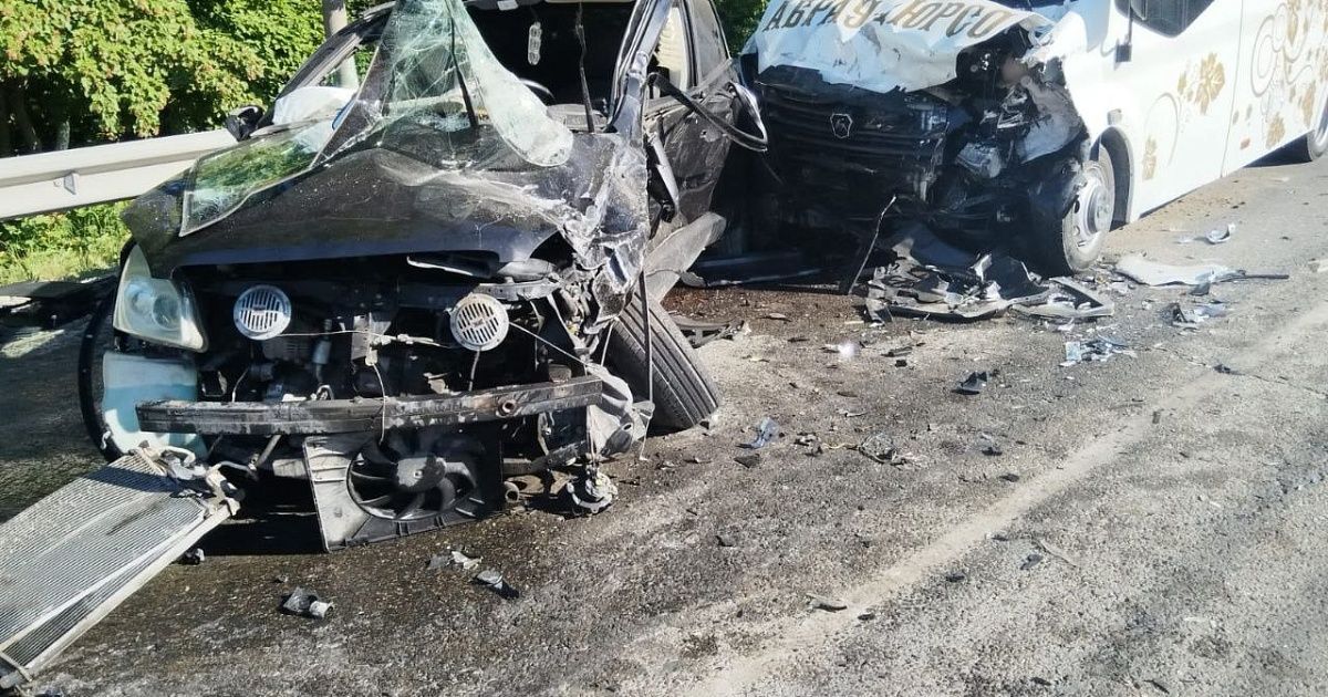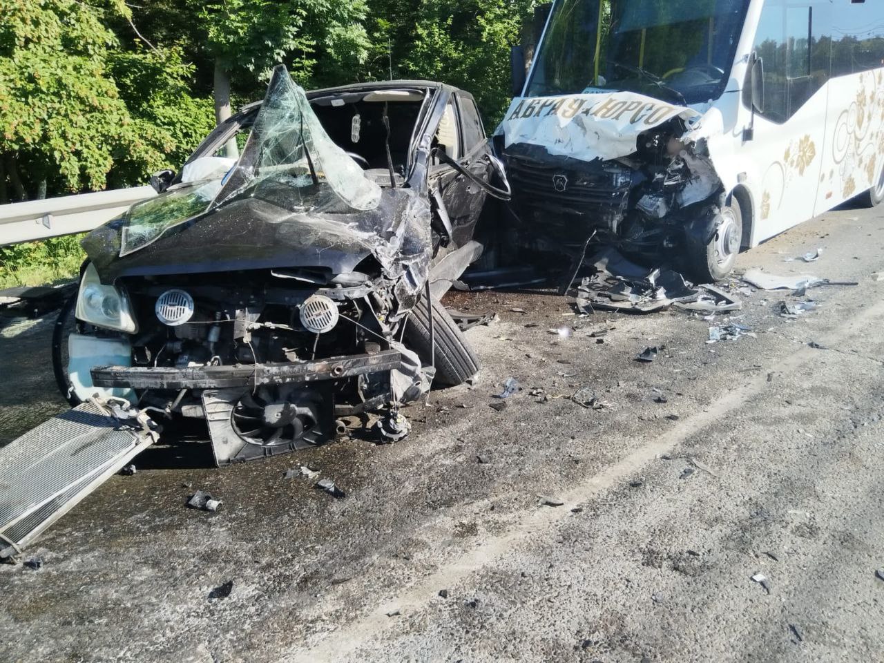 Пассажир и водитель легковушки, а также четыре человека из автобуса госпитализированы с травмами.