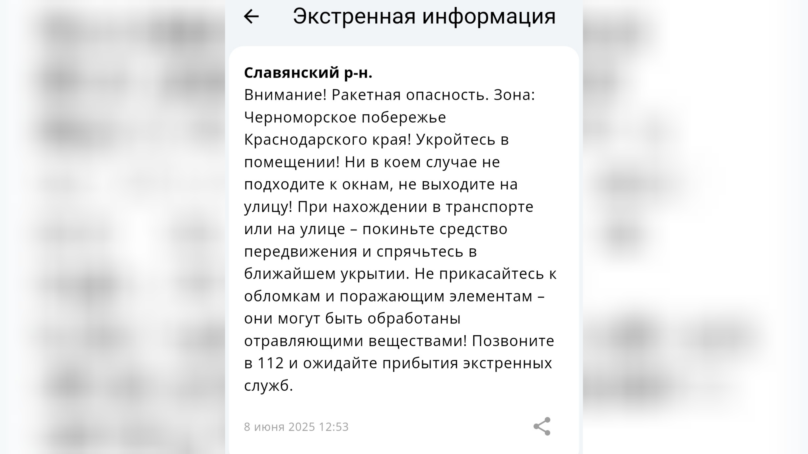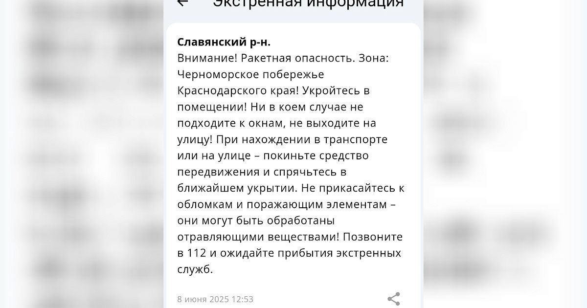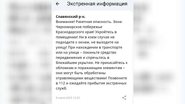 В Краснодарском крае днем 8 июня была объявлена ракетная угроза. Жители региона получили срочное оповещение от Единой государственной системы предупреждения и ликвидации чрезвычайных ситуаций.