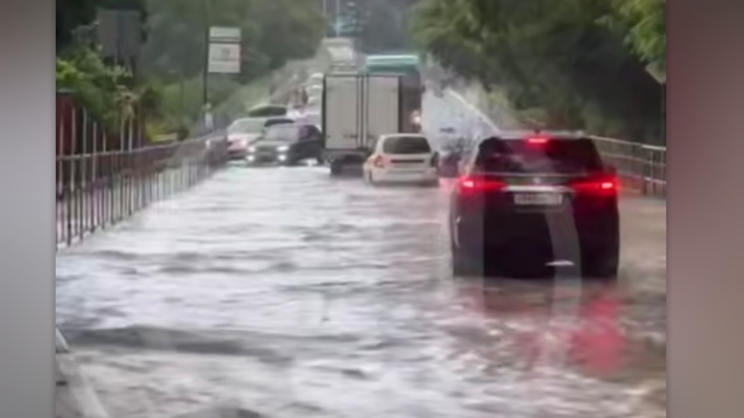 Залповые ливни утром 15 июня превратили дорогу в реку. Образовалась пробка.