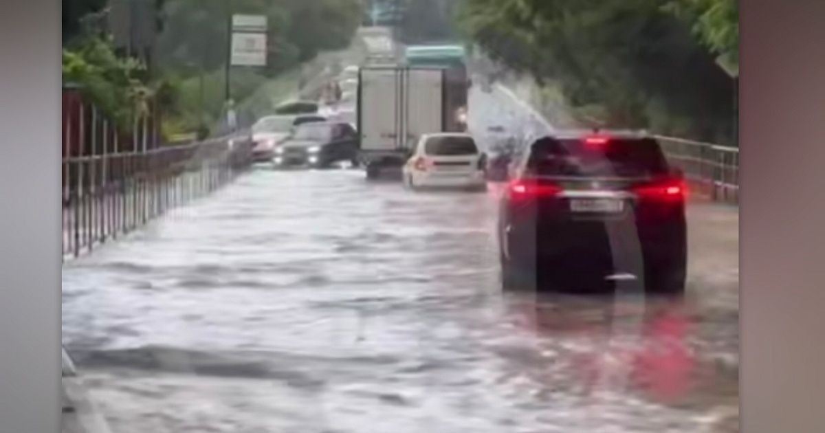 Из-за ливня затопило трассу А-147 в районе посёлка Головинка. Очевидцы сняли последствия стихии. Кадрами поделились с Telegram-каналом «ЧП Сочи».
