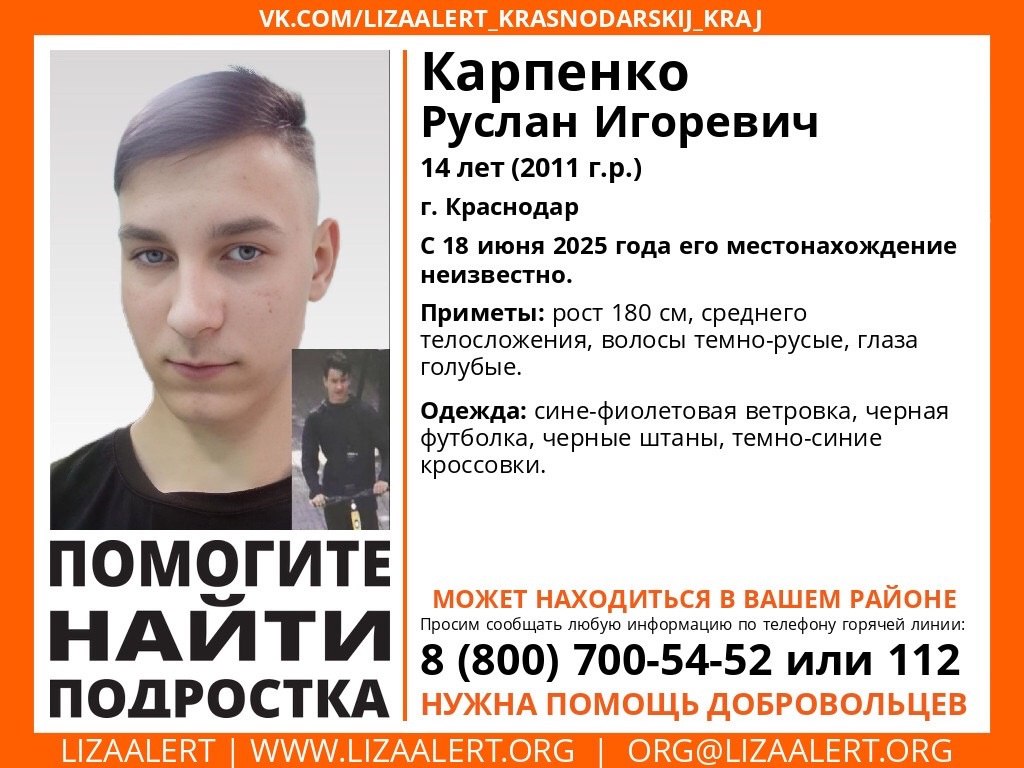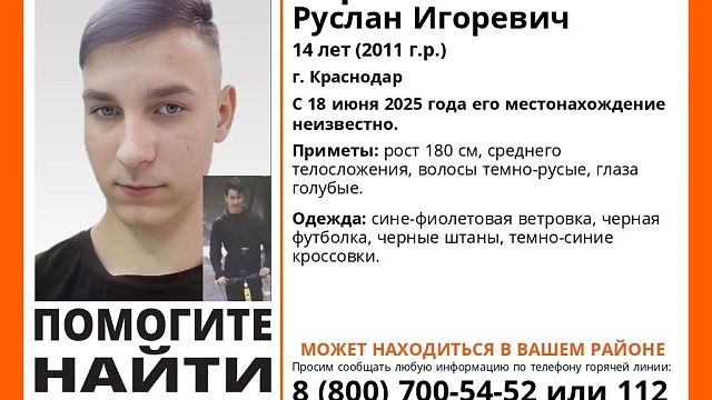 В Краснодаре идут поиски пропавшего Карпенко Руслана Игоревича 2011 года рождения. 14-летний подросток пропал 18 июня, и до настоящего времени его местонахождение не установлено.