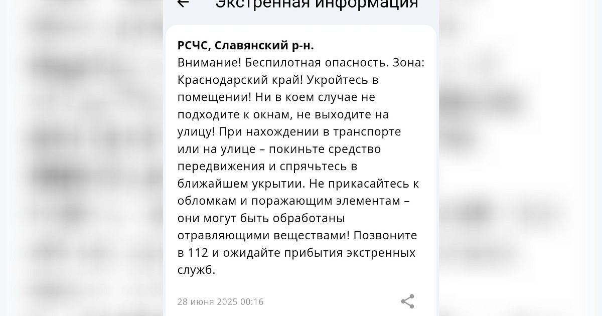 Согласно информации от РСЧС, на всей территории края введен режим «Беспилотная опасность» из-за потенциальной угрозы падения дронов. В связи с этим, населению рекомендовано соблюдать меры предосторожности.